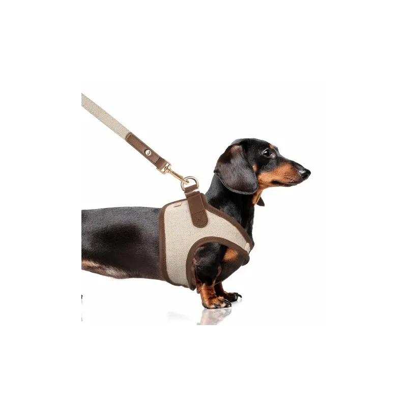 Este arnés está confeccionado en tejido resistente con acabado cuidado, en color beige con detalles en tonos marrones que refuerzan su diseño. Incorpora un sistema de triple cierre compuesto por velcro, clip de seguridad y anillas metálicas, lo que garantiza una sujeción firme y fiable durante el uso. Su estructura tipo chaleco facilita la colocación y mejora el reparto de la presión, aportando mayor confort al perro.