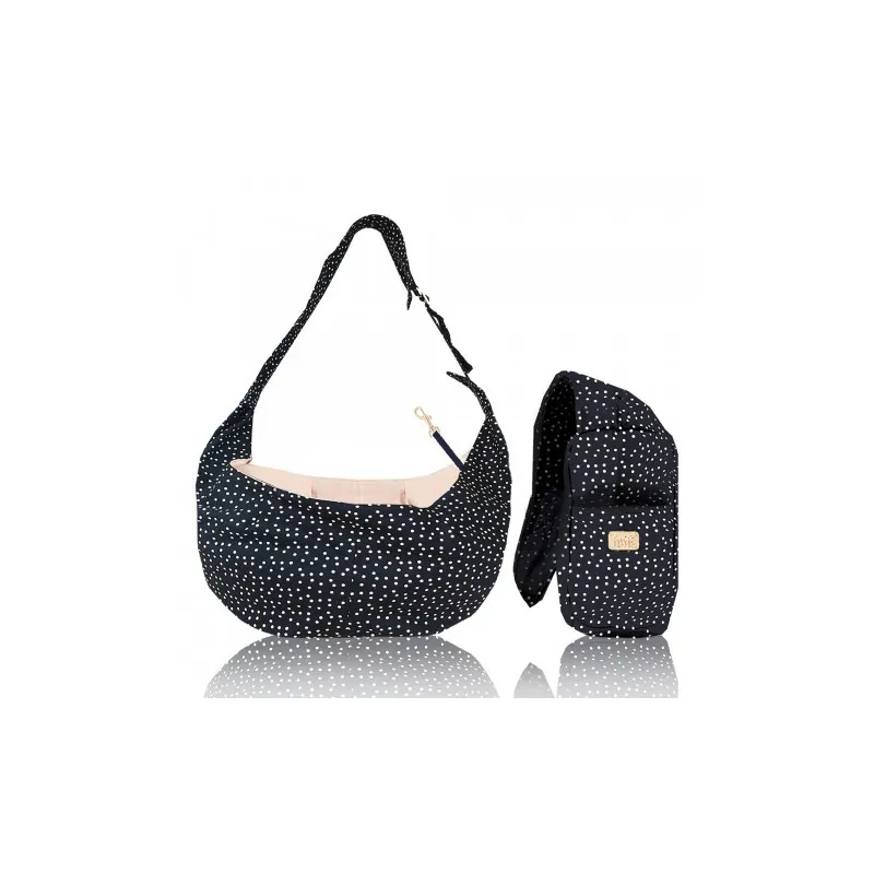 Con su distintivo diseño en gabardina azul marino con lunares rosas, este bolso combina estilo y funcionalidad, ofreciendo una solución ideal para paseos urbanos o desplazamientos donde tu mascota necesita descansar.