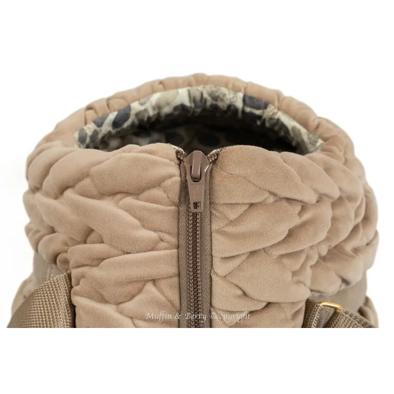 El exterior está confeccionado en 100% poliéster con acabado velour, aportando un aspecto sofisticado y agradable al tacto. En contraste, el interior está realizado en 100% algodón OEKO-TEX®, un tejido suave, transpirable y resistente pensado para el contacto directo con la mascota.