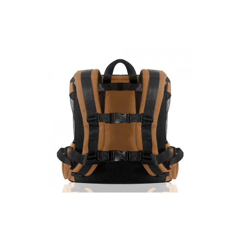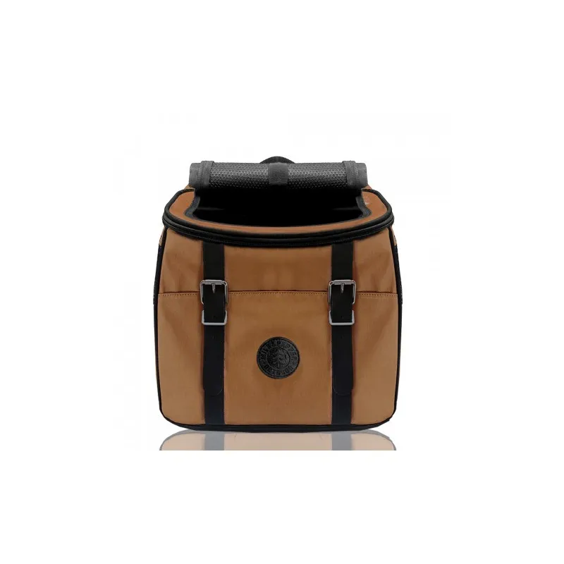 Esta mochila está confeccionada en tejido tipo gabardina en color camel, con un forro interior en interlock negro que aporta suavidad y confort. Incluye un cojín interior extraíble que mejora el descanso del animal durante el transporte. Dispone de ventilación en los laterales y en la parte superior, con opción de apertura o cierre según la necesidad, favoreciendo la circulación del aire. Incorpora refuerzos de espuma transpirable en la espalda y las asas para mayor comodidad, así como correas ajustables de nailon en pecho y cintura que aseguran una buena sujeción. Presenta además detalles decorativos como tiras y una insignia en efecto piel negra.