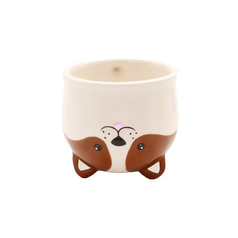 Se trata de una taza de cerámica con diseño invertido en forma de perro. Puede colocarse en dos posiciones, funcionando como taza o como objeto decorativo estable.