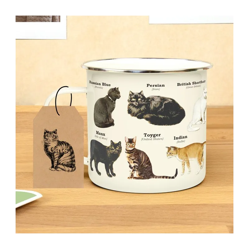 Disfruta de tus bebidas favoritas con esta original taza esmaltada dedicada a las razas de gatos.
