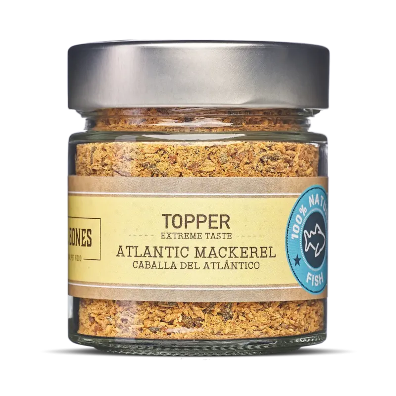 El Topper de Caballa de Mr. Bones es un complemento natural para perros y gatos, elaborado exclusivamente con caballa deshidratada y diseñado para enriquecer su alimentación diaria de forma sencilla y saludable.
