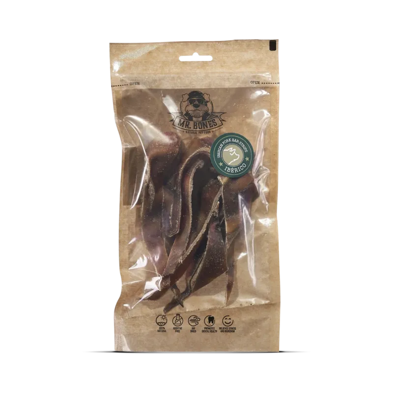 La Oreja de Cerdo Ibérico en Tiras de Mr. Bones es un snack natural para perros en formato mordedor, elaborado exclusivamente con oreja de cerdo ibérico deshidratada para conservar sus nutrientes, sabor y aroma natural.