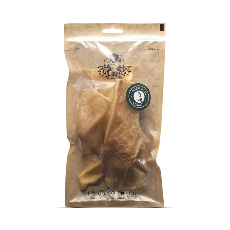 La Piel de Jabalí de Mr. Bones es un snack natural para perros en formato mordedor, elaborado exclusivamente con piel de jabalí deshidratada para conservar sus nutrientes, sabor y aroma natural.