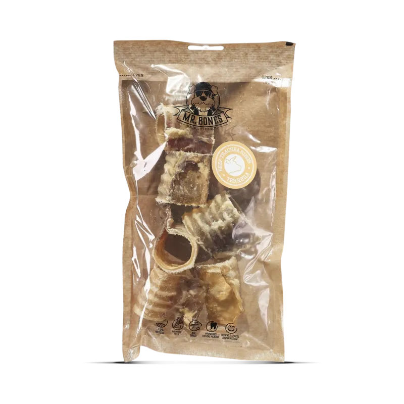 La Tráquea de Ternera en Aros de Mr. Bones es un snack natural para perros en formato mordedor, elaborado exclusivamente con tráquea de ternera deshidratada para conservar sus nutrientes, sabor y aroma natural.