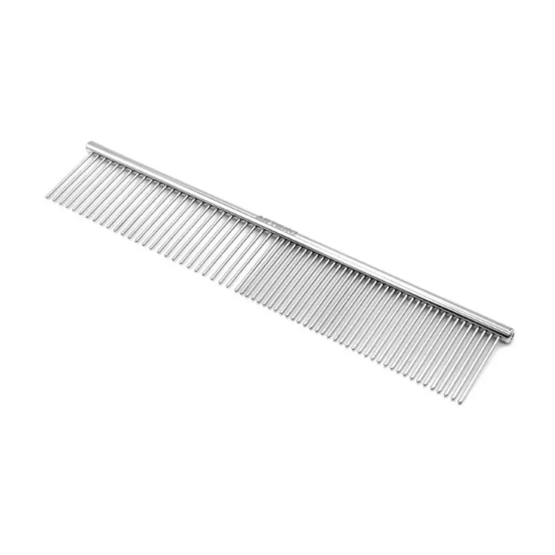 Fabricado en metal con púas largas y acabado cromado, este peine ofrece una gran resistencia y durabilidad, además de un deslizamiento suave sobre el pelaje. Su longitud aproximada es de 18 cm, con púas diseñadas para penetrar en profundidad hasta la raíz del manto.
