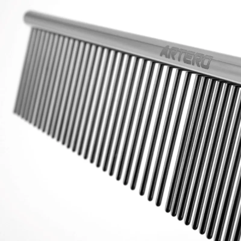 El peine de púa larga de Artero es una herramienta profesional diseñada para el cuidado del pelaje de perros y gatos, especialmente indicada para mantos largos, densos o con subpelo.