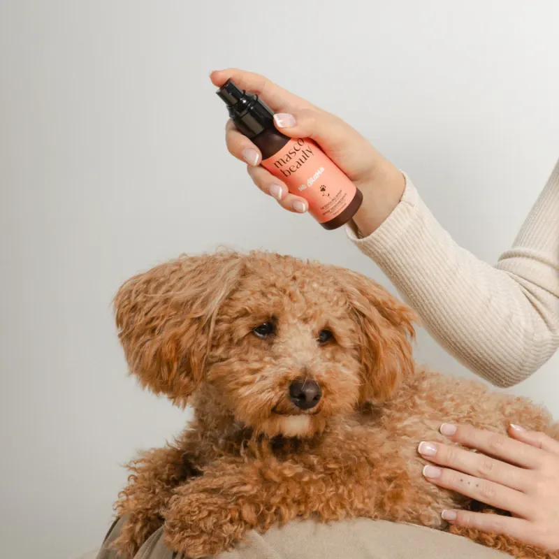 Pulverizar directamente sobre el pelaje seco o húmedo, insistiendo en las zonas con nudos. Dejar actuar unos segundos y cepillar suavemente desde las puntas hacia la raíz hasta desenredar por completo.