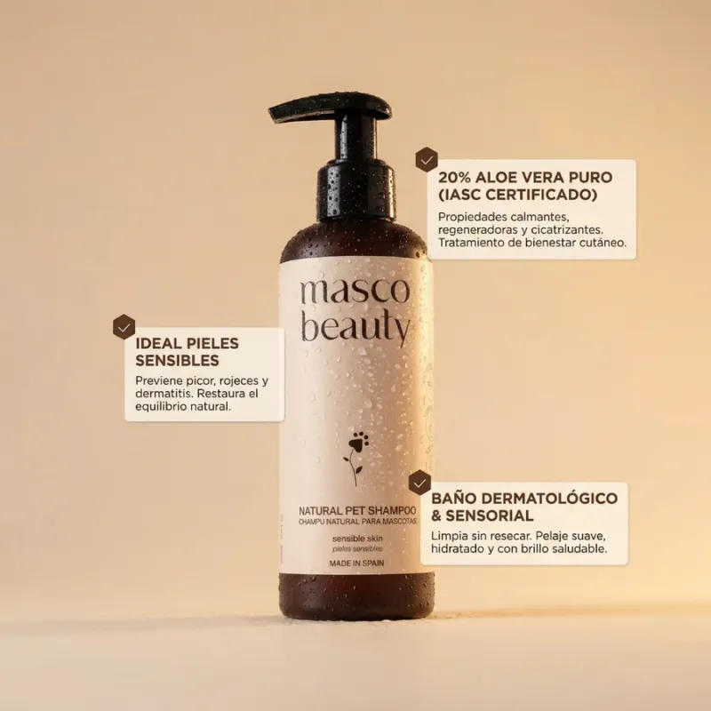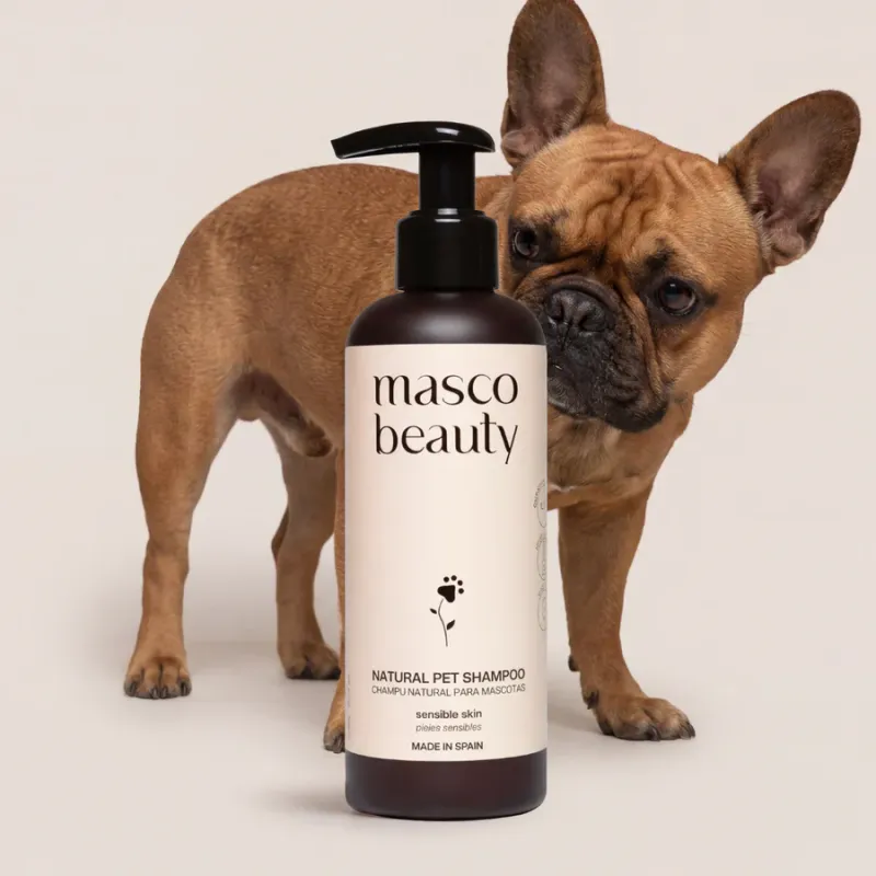Los productos de Masco Beauty son cosméticos naturales diseñados para el cuidado de la piel y el pelaje de mascotas, como perros y gatos, incluyendo champús, sérums y limpiadores.