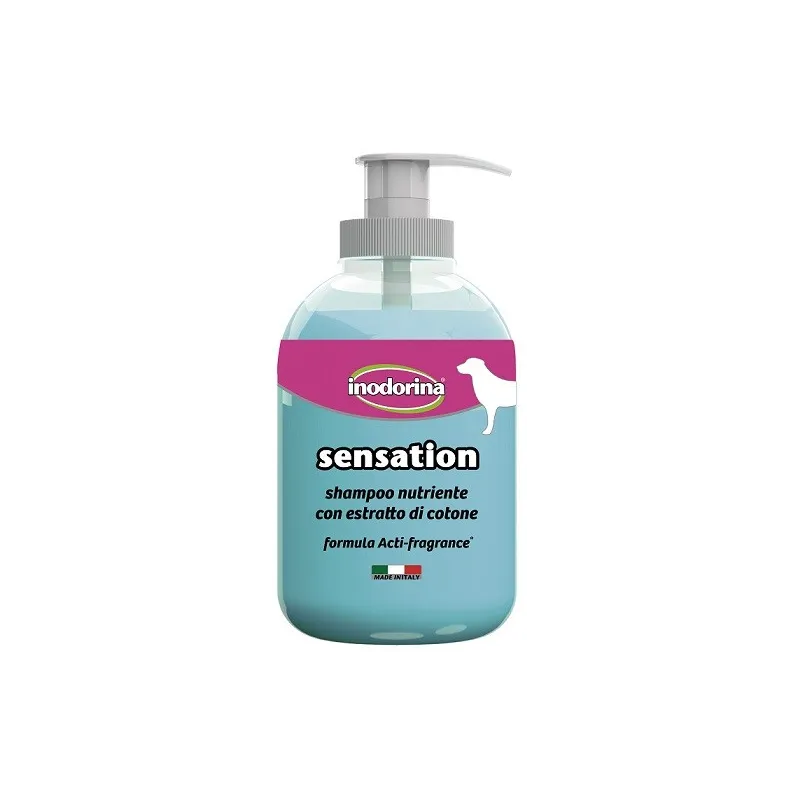 El champú nutritivo Inodorina Sensation con extracto de algodón está formulado para limpiar suavemente el pelaje de perros y gatos, aportando hidratación, suavidad y protección.