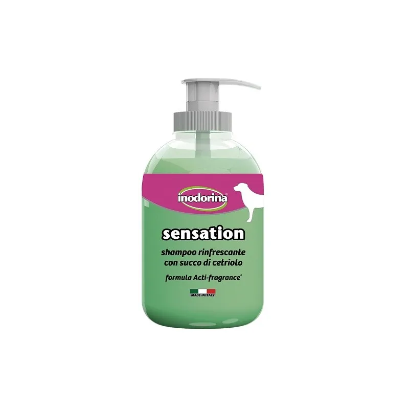 El champú refrescante Inodorina Sensation con extracto de pepino limpia suavemente el pelaje de perros y gatos, proporcionando una agradable sensación de frescor y bienestar tras cada baño.
