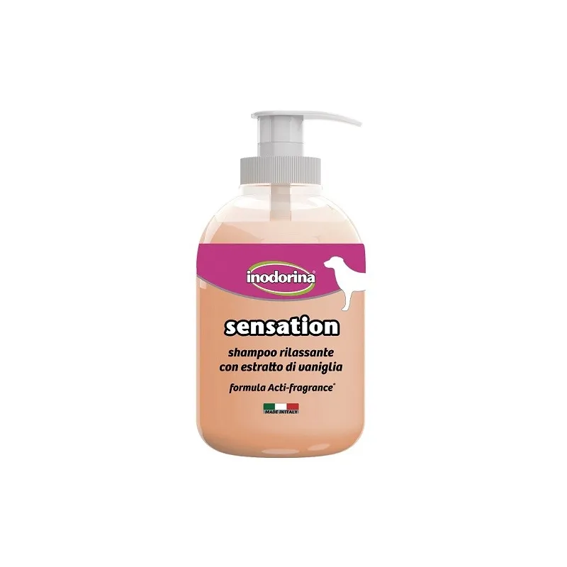 El champú relajante Inodorina Sensation con extracto de vainilla limpia suavemente el pelaje de perros y gatos, proporcionando una agradable sensación de calma y bienestar durante el baño.