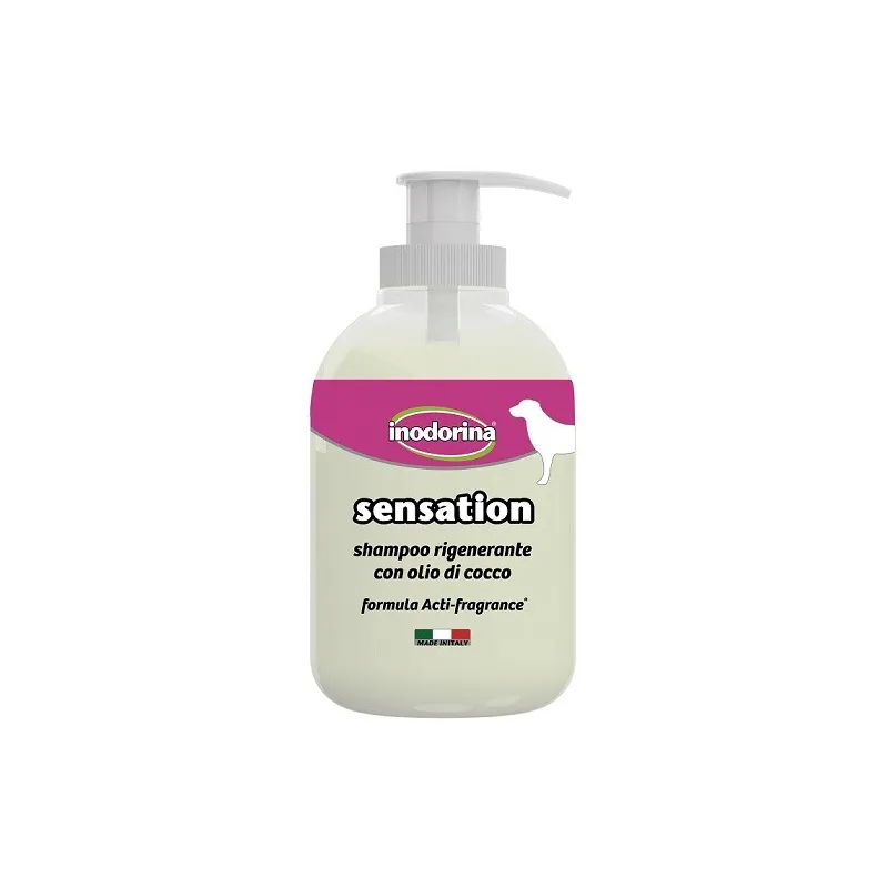 El champú regenerante Inodorina Sensation con aceite de coco está formulado para limpiar delicadamente el pelaje de perros y gatos, aportando nutrición, suavidad y un aspecto más saludable.