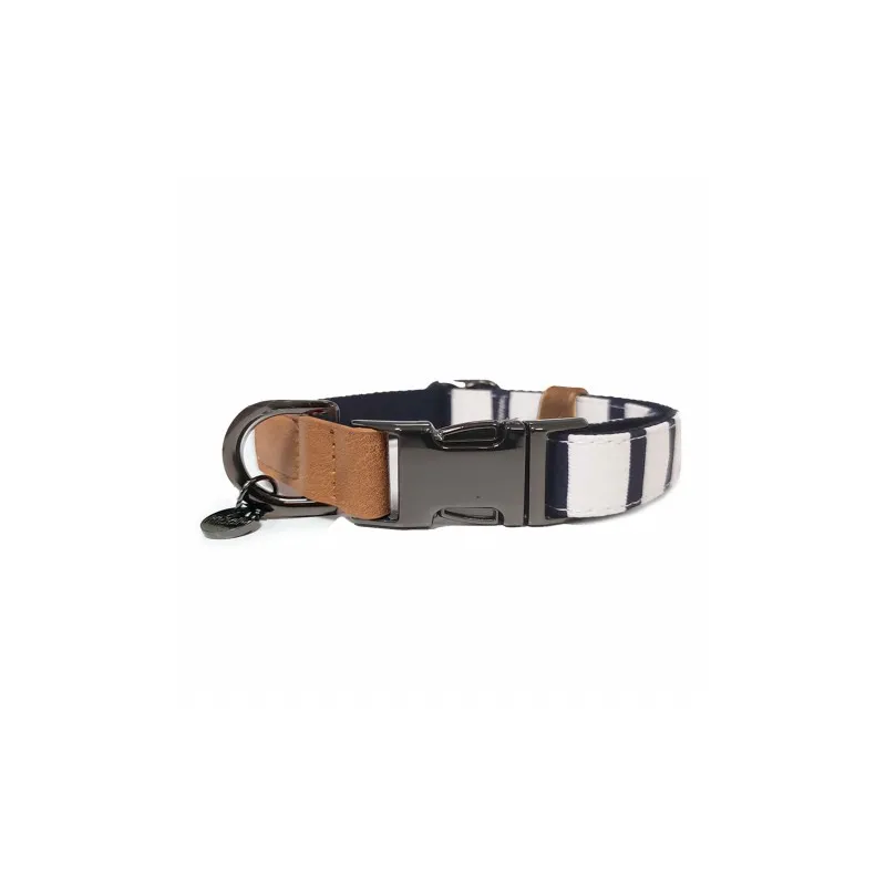 Este collar está fabricado en poliéster con estampado de rayas marineras en azul marino y blanco roto, ofreciendo resistencia y ligereza. Incorpora acabados en material efecto piel vintage en color camel que aportan un toque elegante al diseño. Cuenta con hebillas y anilla metálica en acabado titanio, así como una medalla grabada “M&P”, detalle distintivo de la marca. Su interior está compuesto por material sintético que mejora la durabilidad y el confort en contacto con el cuello del perro.