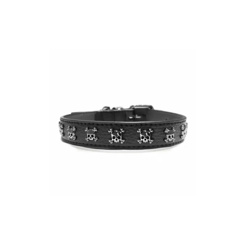 Confeccionado en cuero negro de alta calidad y decorado con remaches en forma de calavera, este collar combina un diseño atrevido con materiales resistentes, ofreciendo una opción ideal para quienes buscan un complemento duradero, original y con personalidad para su mascota.