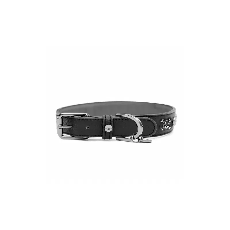 Este collar está fabricado en piel negra granulada, aportando resistencia y un acabado elegante. Cuenta con un forro interior en color gris antracita que mejora el confort en contacto con el cuello del perro. Sus bordes están pulidos en armonía con el diseño, reforzando la durabilidad del conjunto. Incorpora herrajes metálicos en acabado titanio y una medalla con el logotipo “M&P” grabado, sello distintivo de la marca. Destaca especialmente por sus remaches decorativos en forma de calavera en tono titanio, que le aportan un estilo único y diferencial.
