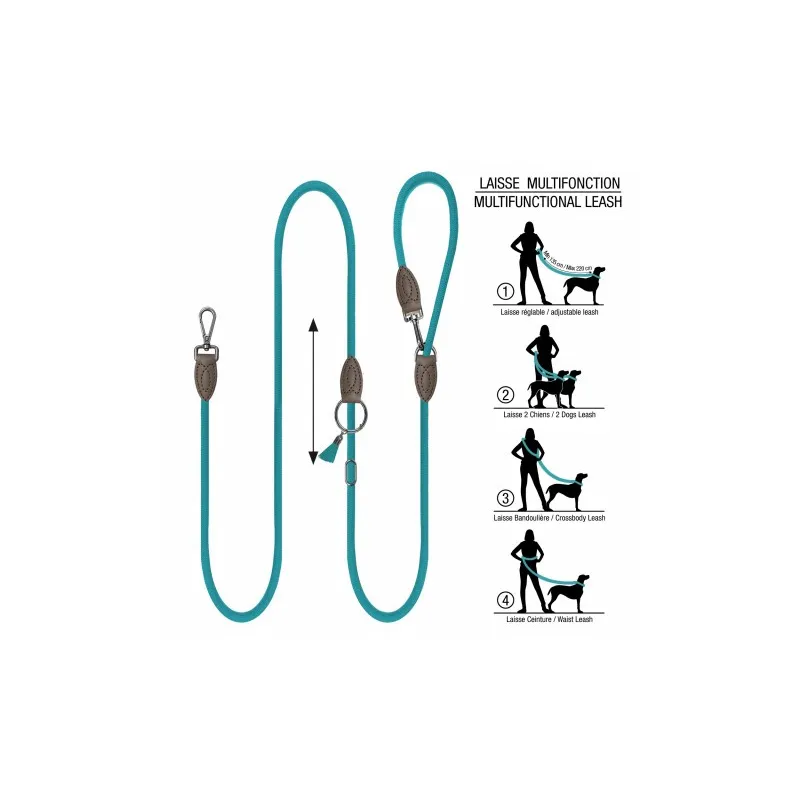 El modelo Kaya destaca por su diseño multifunción con varias posiciones de uso: puede utilizarse como correa clásica, en modo bandolera, alrededor de la cintura o incluso para pasear dos perros al mismo tiempo. Su longitud es ajustable, permitiendo adaptarla fácilmente según la situación y el nivel de control deseado. Este sistema aporta una gran libertad de movimiento y comodidad para el propietario en el día a día.