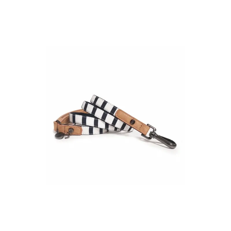 Esta correa está confeccionada en poliéster con estampado de rayas marineras en azul marino y blanco roto, ofreciendo ligereza y resistencia. Incorpora acabados en material efecto piel vintage en color camel que aportan un toque elegante y refuerzan la estructura. Cuenta con mosquetón y herrajes metálicos en acabado titanio que garantizan una sujeción segura, además de una medalla metálica grabada “M&P”, distintiva de la marca.