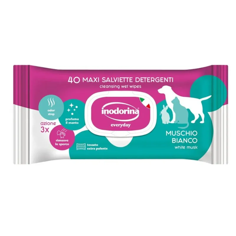 Las toallitas húmedas Inodorina Refresh con fragancia a musgo blanco son ideales para la limpieza diaria de perros y gatos, ayudando a mantener su piel y pelaje limpios, frescos y sin malos olores.