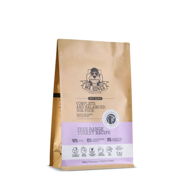 El Dry BARF de Pavo de Mr. Bones es una opción de alimentación natural, completa y equilibrada, inspirada en la dieta BARF y adaptada a un formato seco mucho más práctico para el día a día.