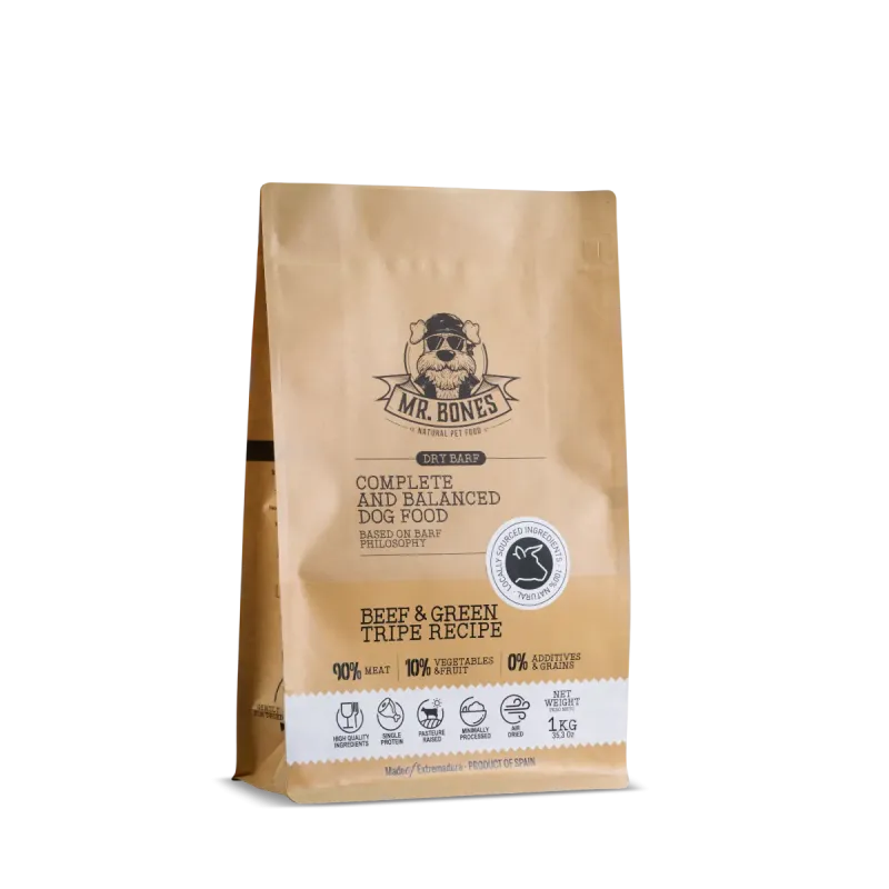 El Dry BARF de Ternera de Mr. Bones es una alimentación natural, completa y equilibrada, inspirada en la dieta BARF y adaptada a un formato seco mucho más cómodo y práctico.