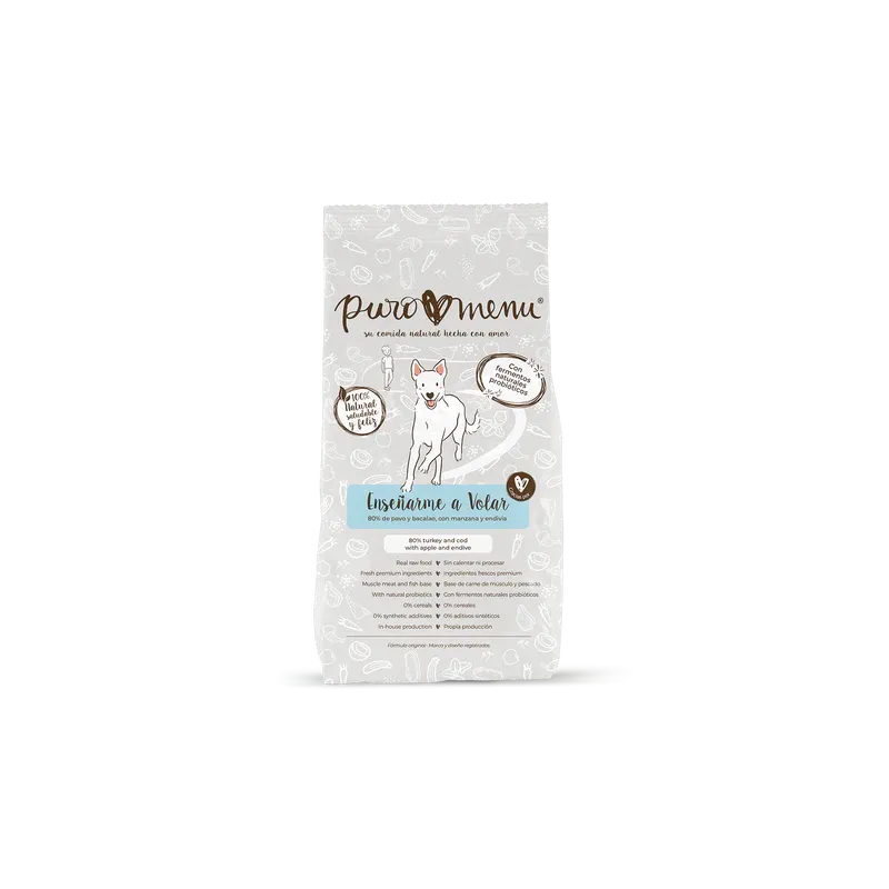 Alimento BARF completo y equilibrado para perros de cualquier raza, elaborado con un 80% de pavo y bacalao, e incorporando fermentos vegetales probióticos. Es una receta 100% natural, sin cereales, gluten ni aditivos sintéticos, con carne y pescado fresco de alta calidad como ingredientes principales.