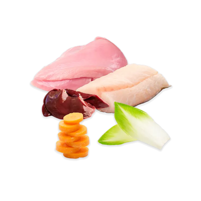 Este menú es único en el mundo de la dieta natural. Los ingredientes principales son el pavo y el bacalao, ambos ligeros y altamente palatables y se combinan con verduras y frutas frescas y suplementos naturales. El ingrediente estrella es la zanahoría BIO fermentada, obtenida mediante fermentación salvaje.