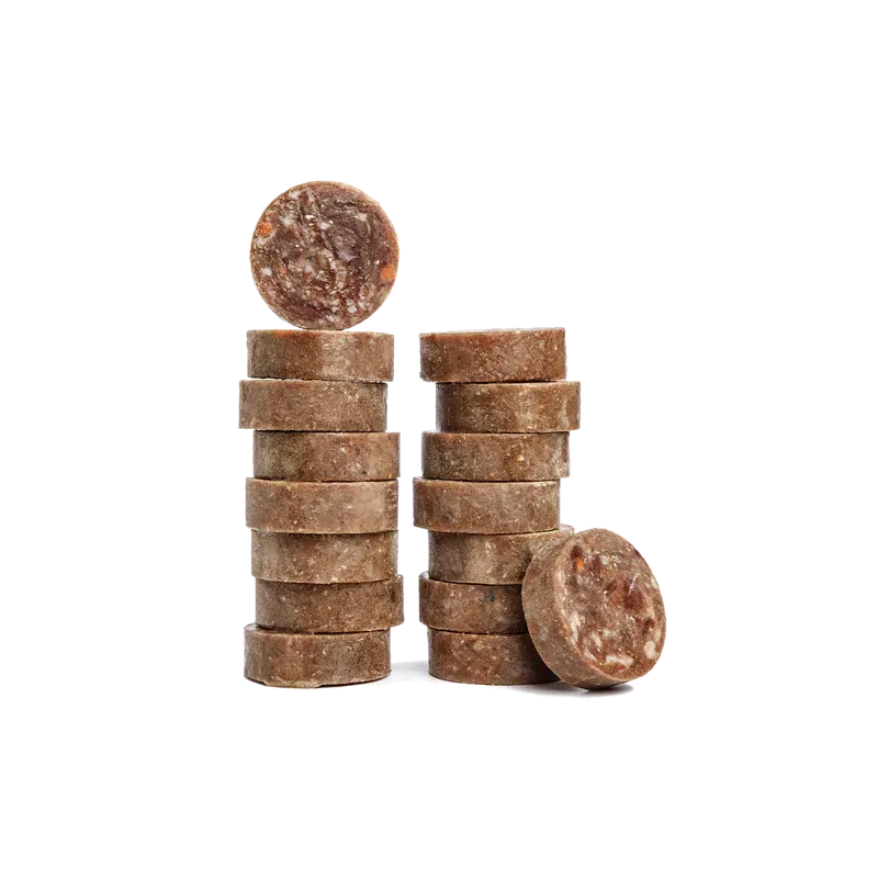 La parte animal de los menús contiene carne de músculo en su mayoría, vísceras (bazo, pulmón, hígado y corazón) en la proporción adecuada, y hueso molido, para asegurar los niveles de minerales necesarios y el óptimo balance calcio-fósforo.