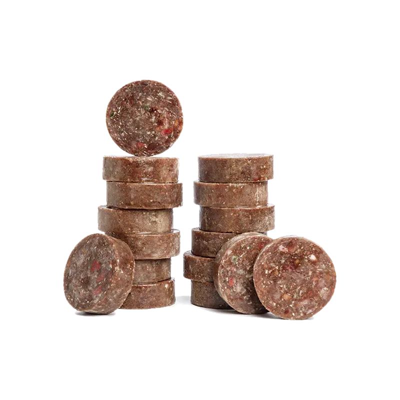 La parte animal de los menús contiene carne de músculo en su mayoría, vísceras (bazo, pulmón, hígado y corazón) en la proporción adecuada, y hueso molido, para asegurar los niveles de minerales necesarios y el óptimo balance calcio-fósforo.