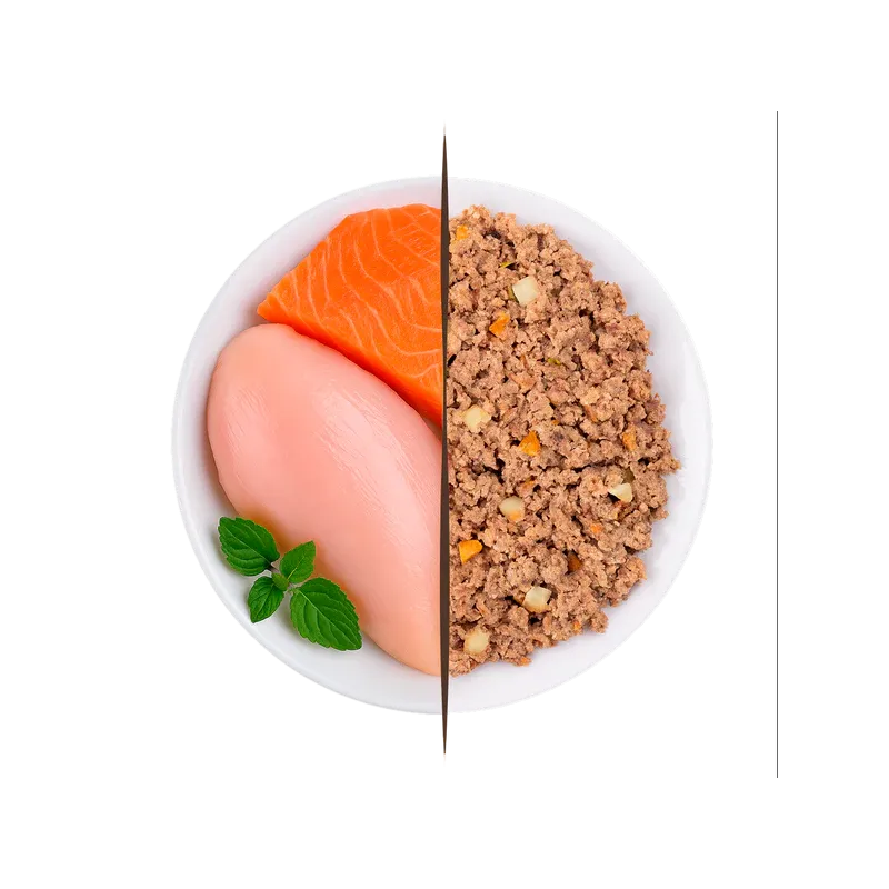 Alimento completo y equilibrado para gatos, cocinado al vapor a baja temperatura para preservar al máximo los nutrientes. Elaborado con un 96% de pollo y salmón, e incorporando menta felina, ofrece sabor, jugosidad y un aporte natural de omega 3 en un solo menú.