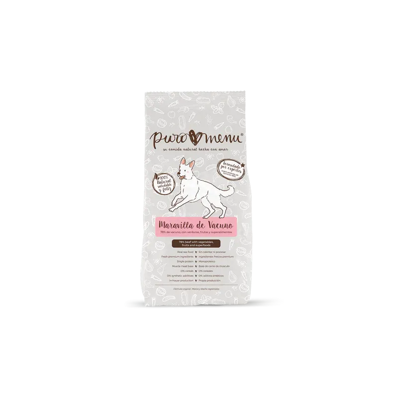 Es un menú monoproteico, con una única fuente de proteína animal, cuyo ingrediente principal es carne fresca de músculo. El vacuno aporta aminoácidos esenciales, así como minerales como hierro y zinc y vitamina B12, favoreciendo la energía y vitalidad del perro.