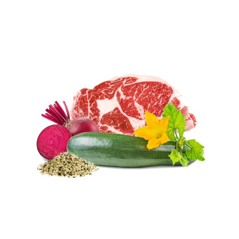 Alimento BARF completo y equilibrado para perros, elaborado con un 78% de vacuno junto con verduras, frutas y superalimentos. Se trata de una receta 100% natural, sin aditivos sintéticos ni cereales, basada en ingredientes frescos y mínimamente procesados.