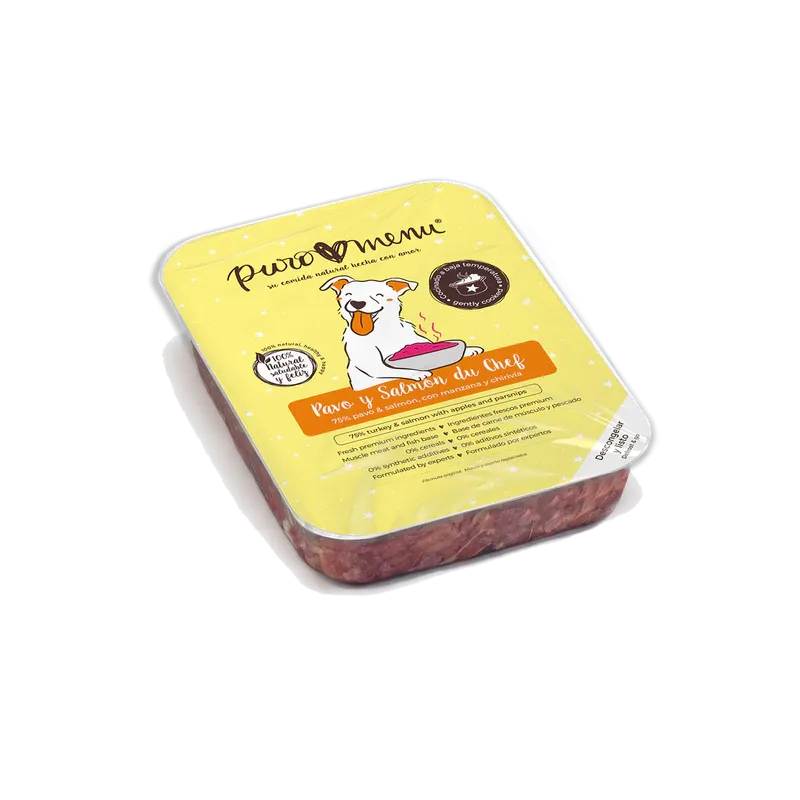 Alimento completo y equilibrado para perros, cocinado al vapor a baja temperatura para preservar al máximo los nutrientes. Elaborado con un 75% de pavo y salmón e incorporando manzana y chirivía, ofrece una receta 100% natural, sin aditivos sintéticos ni cereales.