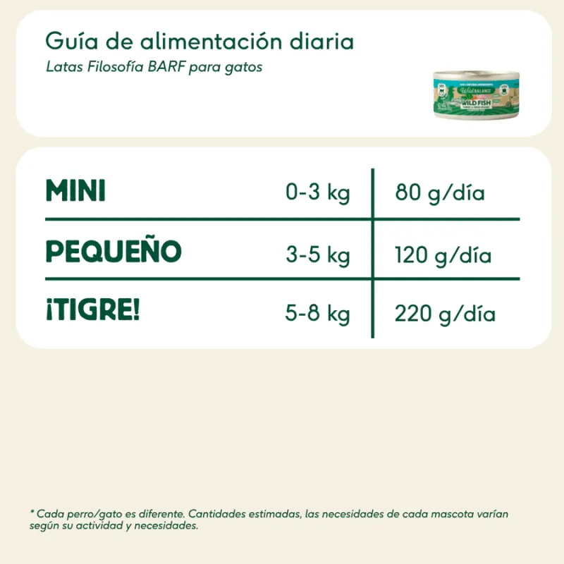 La lata de pescado para gatos de Wild Balance combina pescaditos salvajes con carne de pavo en una receta completa, natural y muy sabrosa. Esta combinación aporta proteínas de alta calidad junto a ácidos grasos Omega 3, esenciales para favorecer un pelaje brillante y el bienestar general del gato.