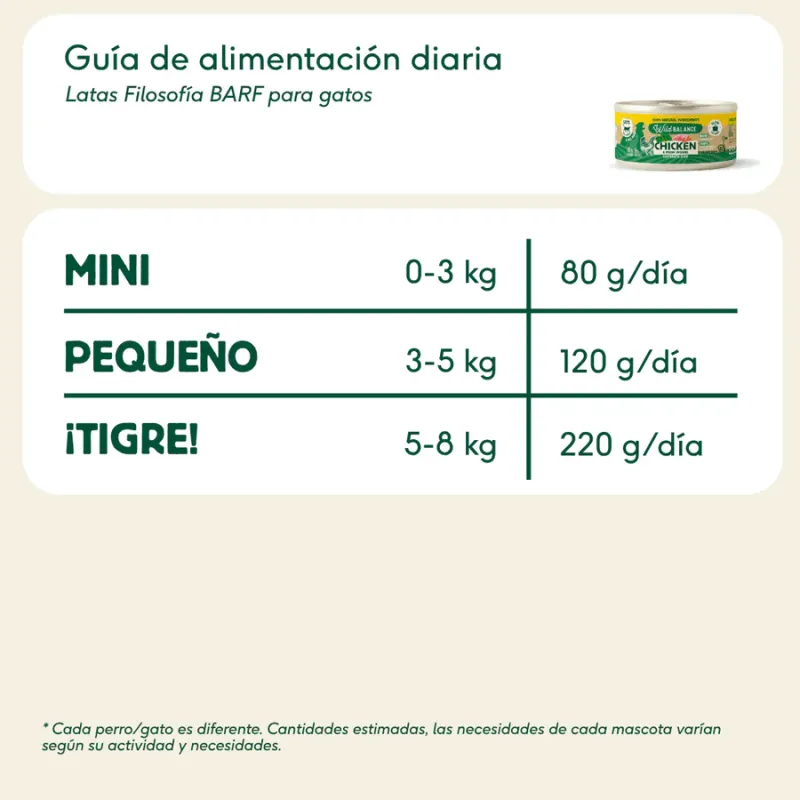 La lata de pollo para gatos de Wild Balance es una opción ligera, natural y altamente nutritiva, elaborada con un alto porcentaje de carne fresca de pollo. Esta receta aporta proteínas de alto valor biológico y es especialmente adecuada para gatos con digestiones sensibles o que necesitan controlar su peso.