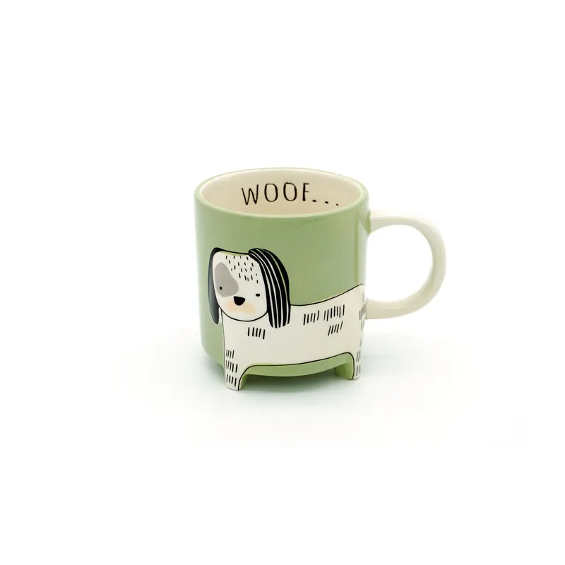 Esta taza destaca por su diseño tridimensional en forma de perro, donde la figura sobresale del cuerpo de la taza creando un efecto visual divertido y llamativo. Las patas del perro actúan como base y su forma aporta un estilo único que no pasa desapercibido. En el interior, el detalle “Woof” añade un toque extra de personalidad.
