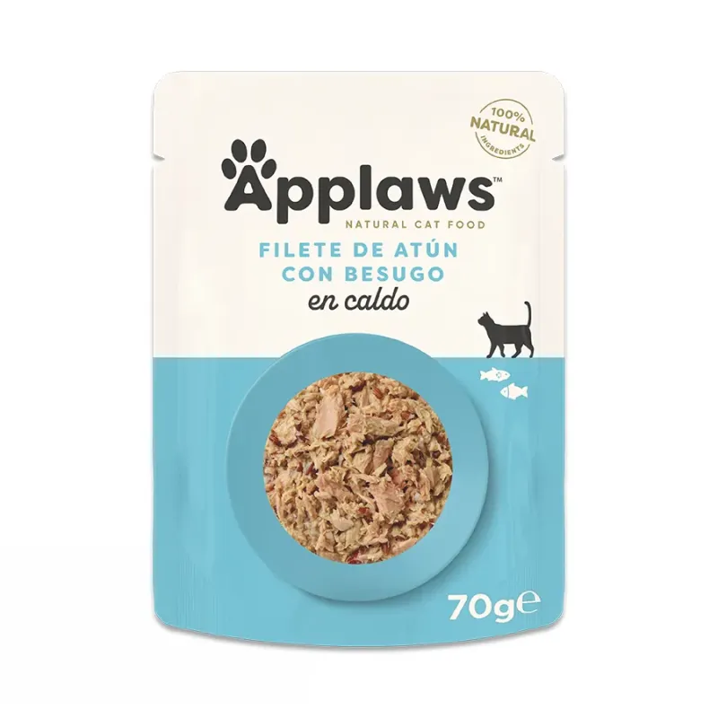 Applaws Atún y Besugo en caldo es una receta húmeda complementaria para gatos adultos, elaborada con ingredientes 100% naturales y una composición simple y transparente.