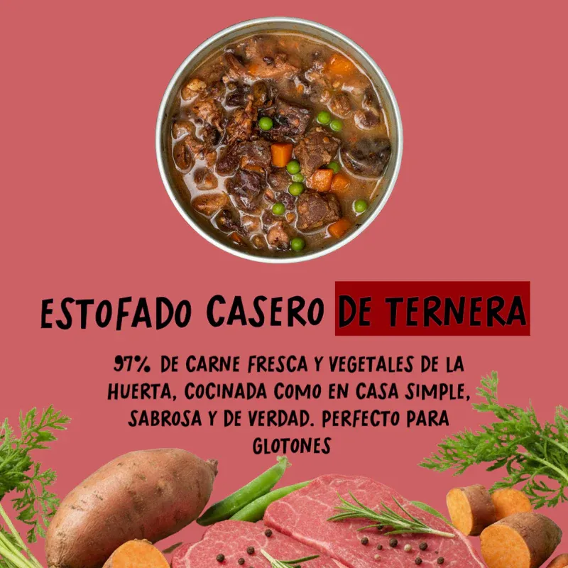 Sin conservantes, colorantes ni aditivos artificiales, este estofado ofrece una alimentación más natural y cercana a la comida casera, perfecta como plato principal o para enriquecer el pienso diario.
