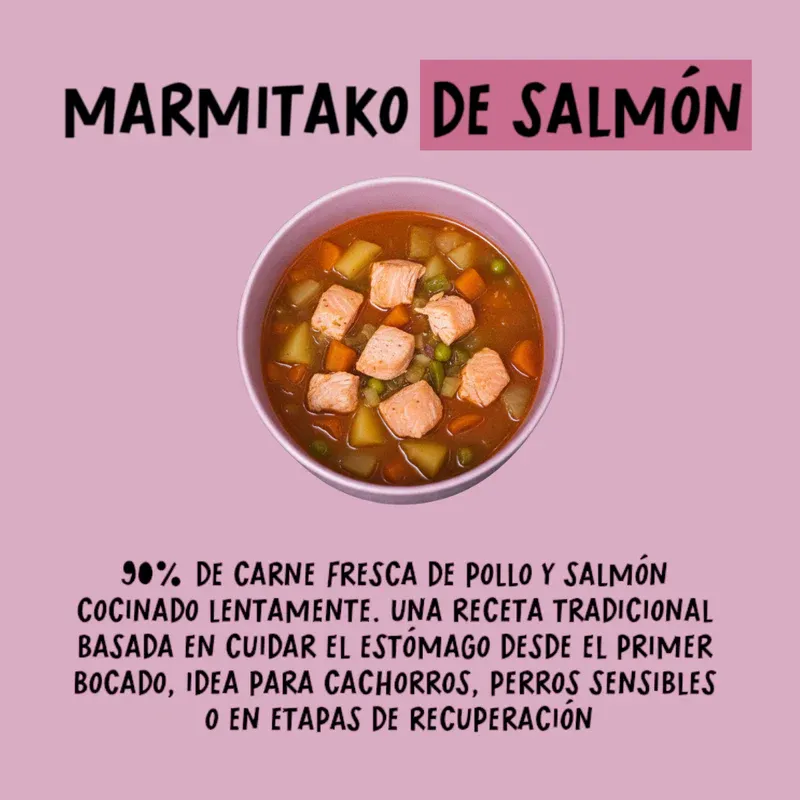 Alimento húmedo gourmet para perros elaborado con salmón, inspirado en una receta tipo marmitako que combina sabor, jugosidad y una presentación especialmente apetecible. Su textura suave y su cuidada preparación realzan el sabor natural de los ingredientes, ofreciendo una experiencia diferente en cada comida.