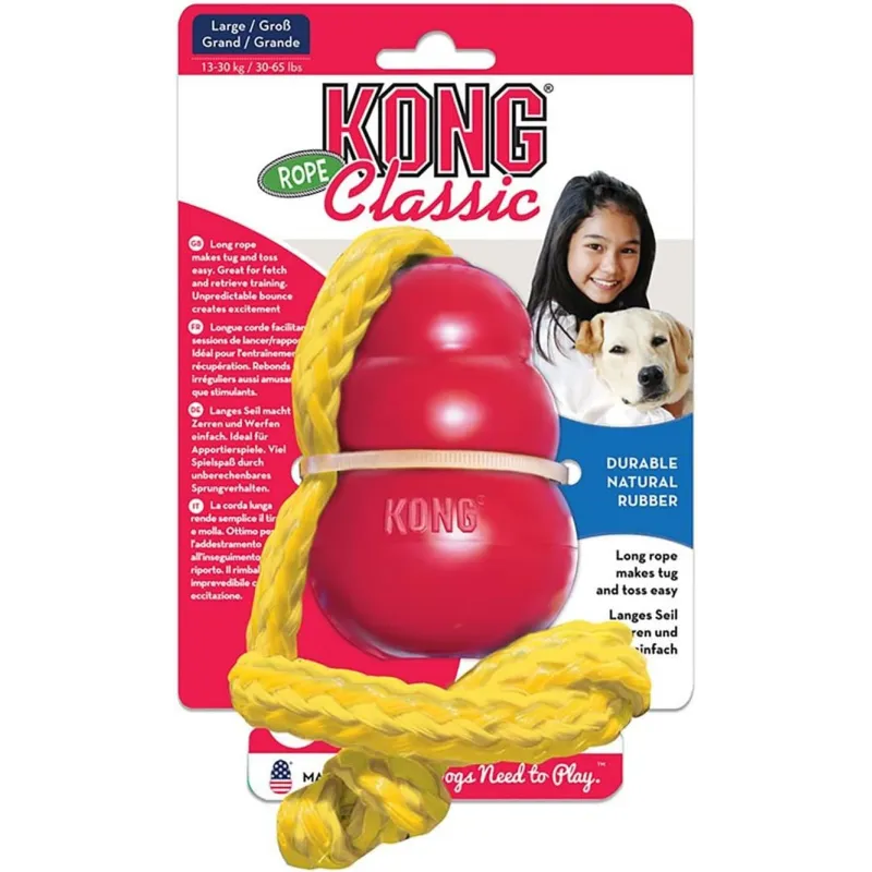 KONG Classic with Rope es un juguete para perros que combina el diseño clásico de caucho natural con una cuerda resistente. Está pensado para juegos de lanzar, recoger y tirar, facilitando la interacción entre perro y dueño.
