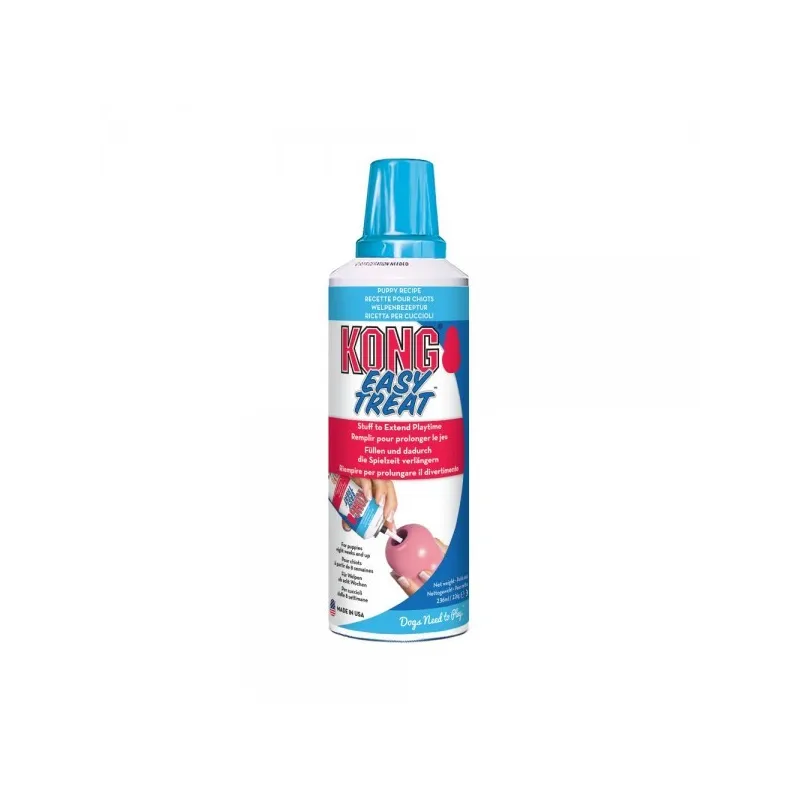 KONG Easy Treat Puppy es una pasta comestible para perros especialmente formulada para cachorros, diseñada para rellenar juguetes KONG de forma fácil y limpia gracias a su práctico envase con boquilla dosificadora.