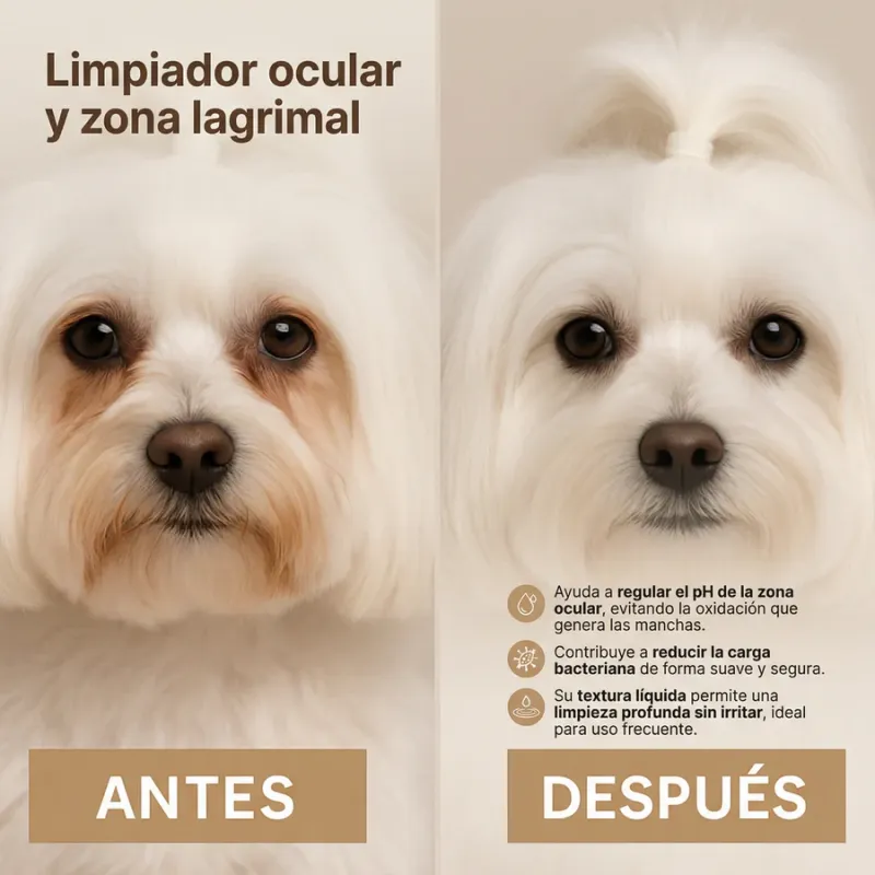 Además de limpiar, este producto contribuye a reducir y prevenir las manchas oscuras causadas por el lagrimeo, especialmente visibles en perros de pelaje claro. Su pH equilibrado, similar al de la lágrima, permite un uso frecuente sin riesgo de irritación, favoreciendo una rutina diaria segura y eficaz.