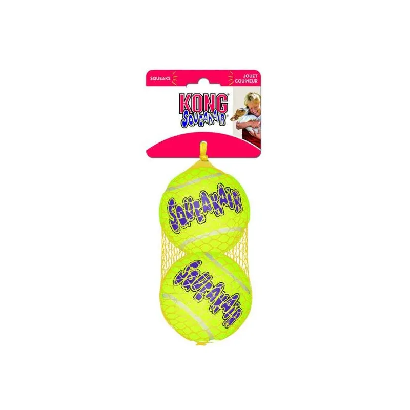 KONG SqueakAir Balls es un pack de 2 pelotas para perro que combina el formato de pelota de tenis con sonido para fomentar el juego de lanzar y recoger.