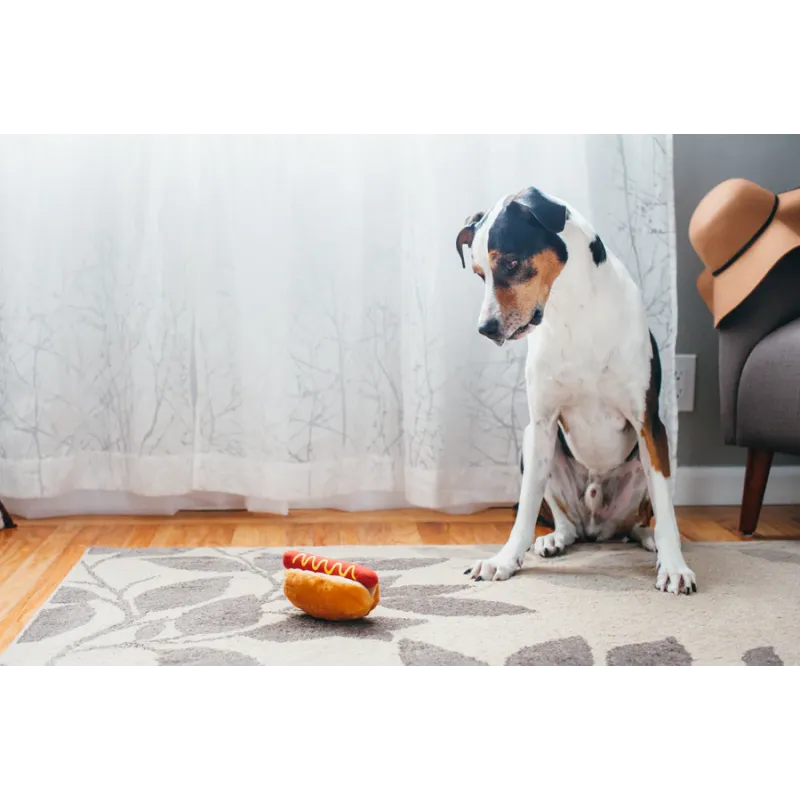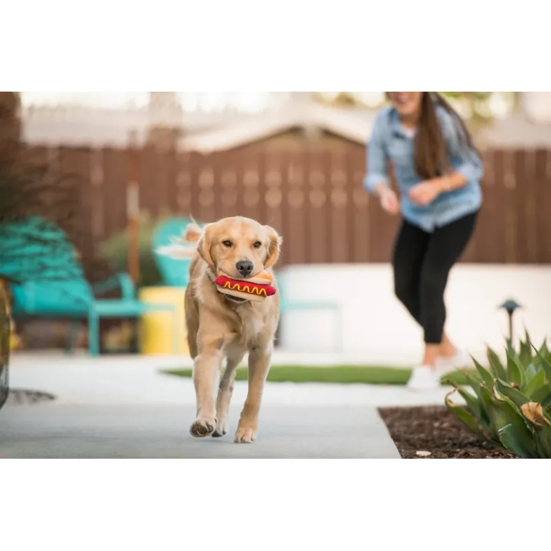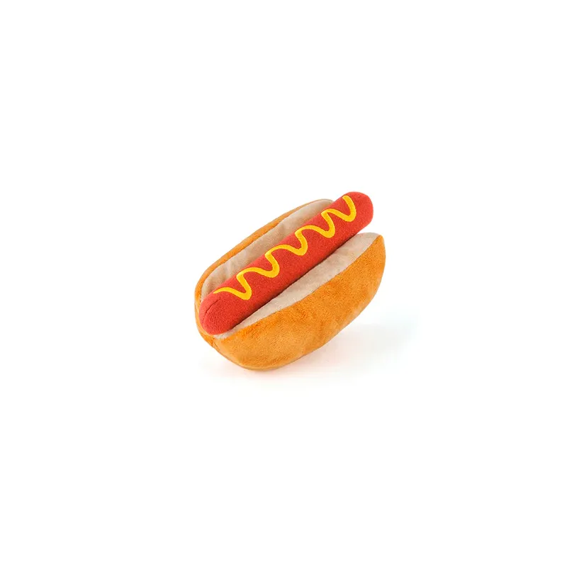 Divertido juguete de peluche con forma de perrito caliente, con squeaker interior y texturas que estimulan el juego y mantienen a tu mascota activa y entretenida.