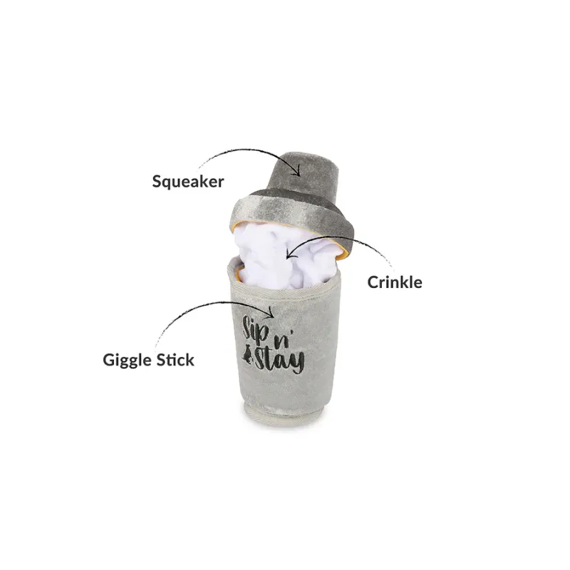 Original juguete de peluche con forma de coctelera, con sonido tipo giggle stick, squeaker y efecto crujiente que estimulan el juego interactivo y la curiosidad de tu mascota.