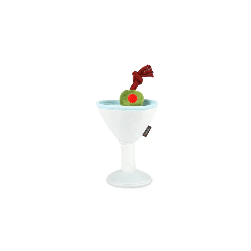 Original juguete de peluche con forma de copa de martini, con squeaker tubular, textura crujiente y divertidos detalles colgantes que estimulan el juego interactivo.