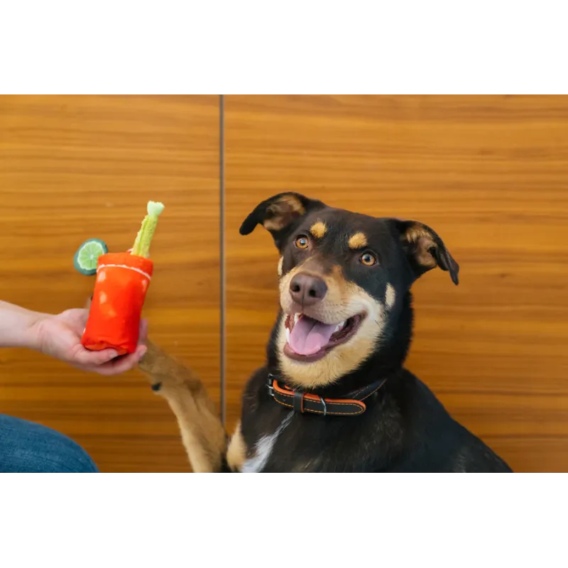 Divertido juguete de peluche con forma de cóctel tipo Bloody Mary, con squeaker y múltiples texturas crujientes que estimulan el juego y despiertan la curiosidad de tu mascota.