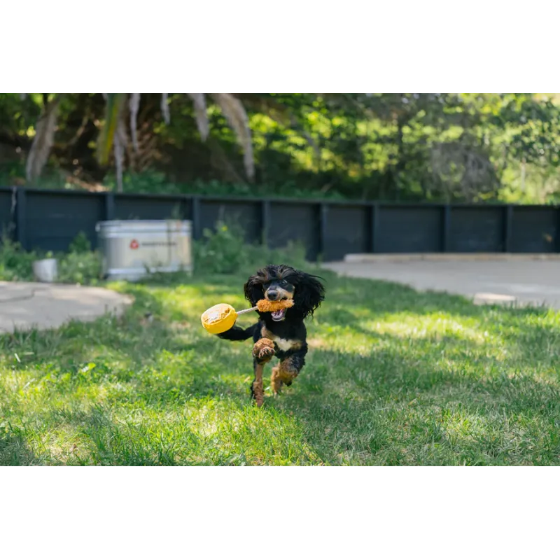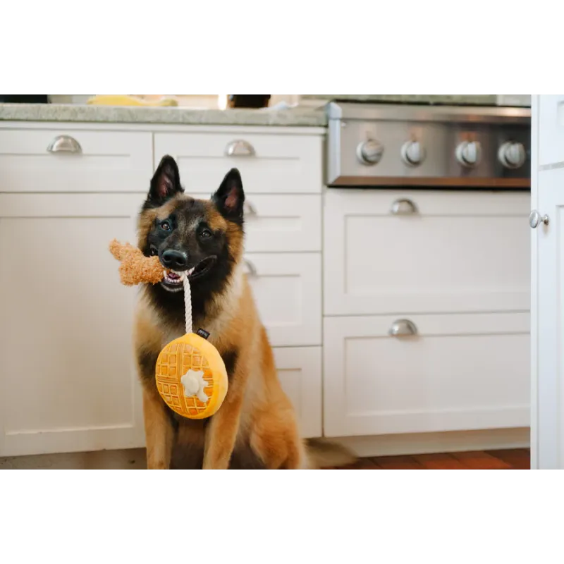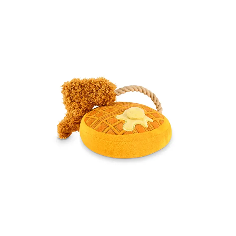 Divertido juguete de peluche con forma de pollo y gofre, con squeakers, textura crujiente y cuerda integrada que estimulan el juego interactivo y el tira y afloja.