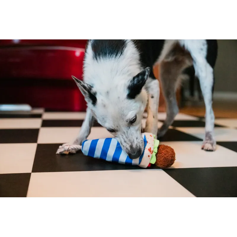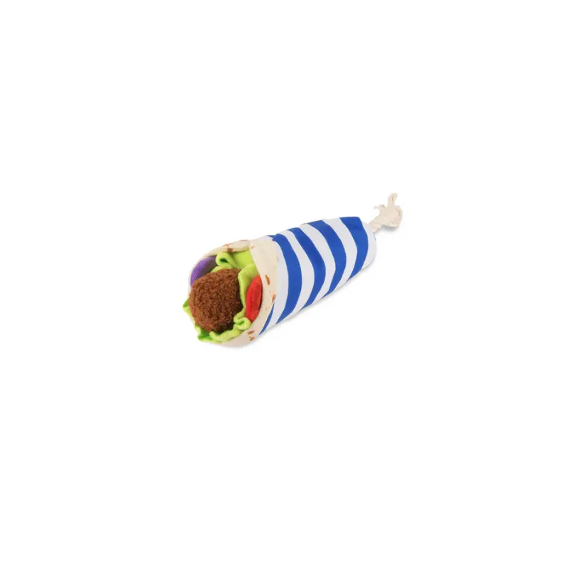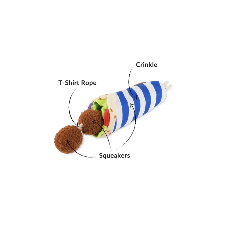 Original juguete de peluche con forma de wrap de falafel, con piezas móviles, squeakers y capas crujientes que estimulan el juego interactivo y la curiosidad de tu mascota.